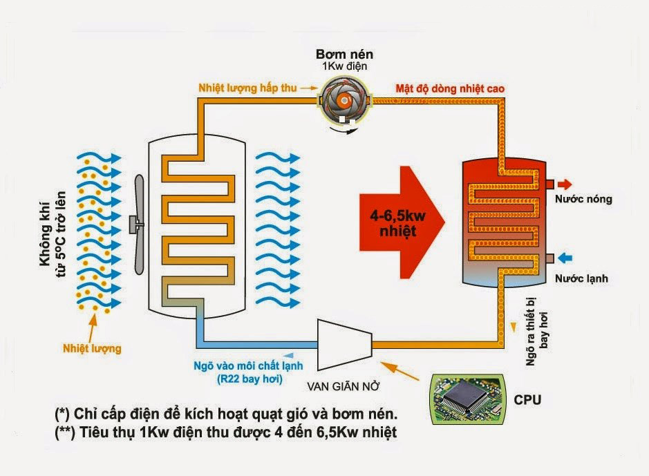4 bộ phận này liên kết với nhau thành chu trình khép kín, lưu thông trong đó là một chất tải nhiệt trung gian thân thiện với mội trường. Để truyền nhiệt cho nước, chất tải nhiệt phải trải qua 4 giai đoạn trong một vòng tuần hoàn nhiệt.